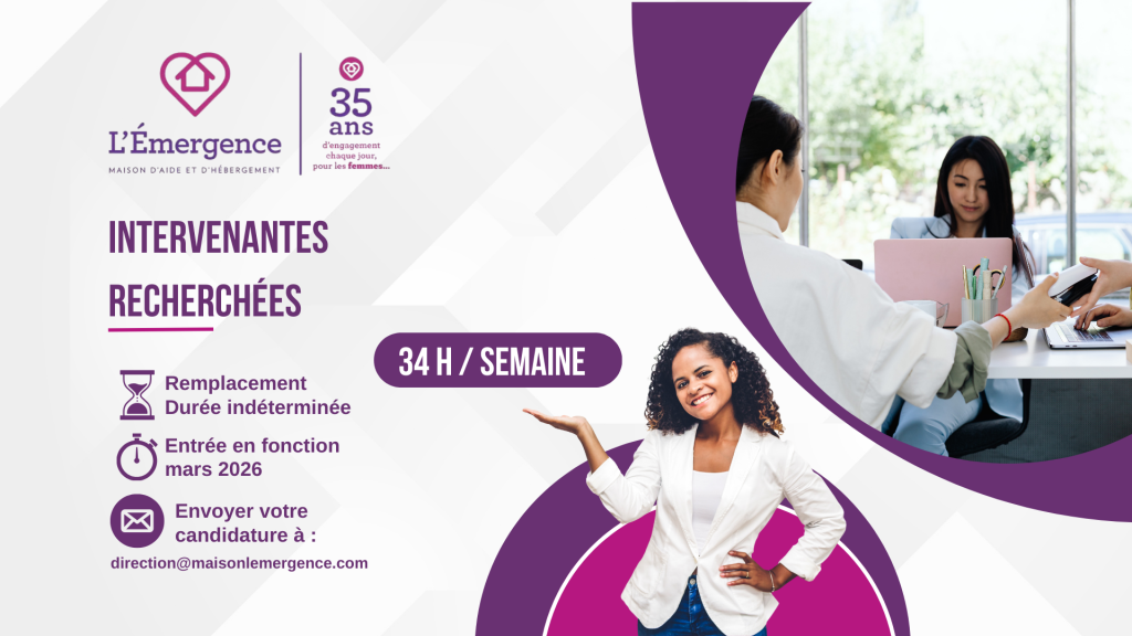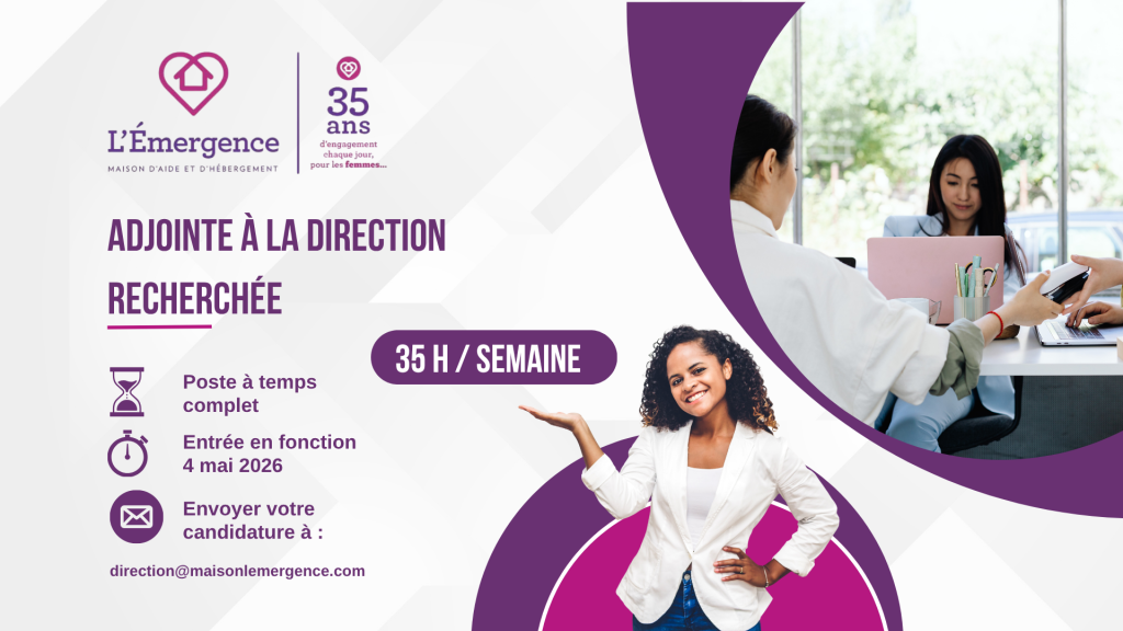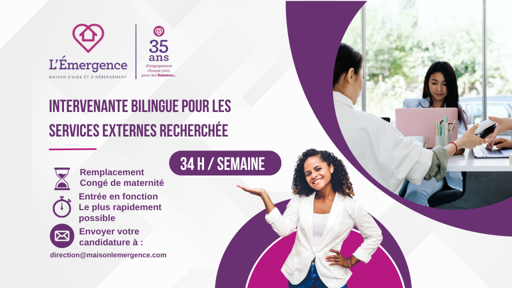 Intervenantes – Remplacements de congés de maternité La Maison d’aide et d’hébergement L’Émergence est à la recherche d’une intervenante pour son service 24/7 ainsi que d’une intervenante anglophone pour son service de deuxième étape (Maison Mary Grace), afin de pourvoir des postes temporaires dans le cadre de remplacements de congés de maternité. Horaire de travail […]
