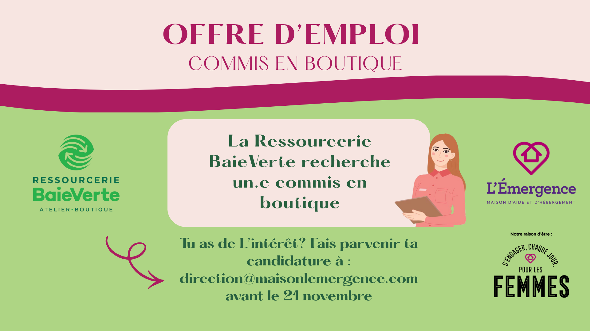 La Maison d’aide et d’hébergement L’Émergence est à la recherche d’un.e commis pour son atelier-boutique la Ressourcerie BaieVerte.