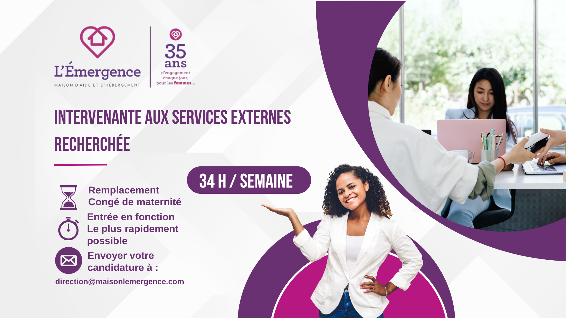 La Maison d’aide et d’hébergement L’Émergence est à la recherche d’une intervenante pour les services cliniques externes. L’horaire de travail est de 4 jours par semaine, pour un total de 34 heures. Les quarts de travail sont de jour, avec une certaine flexibilité selon les disponibilités de la clientèle.